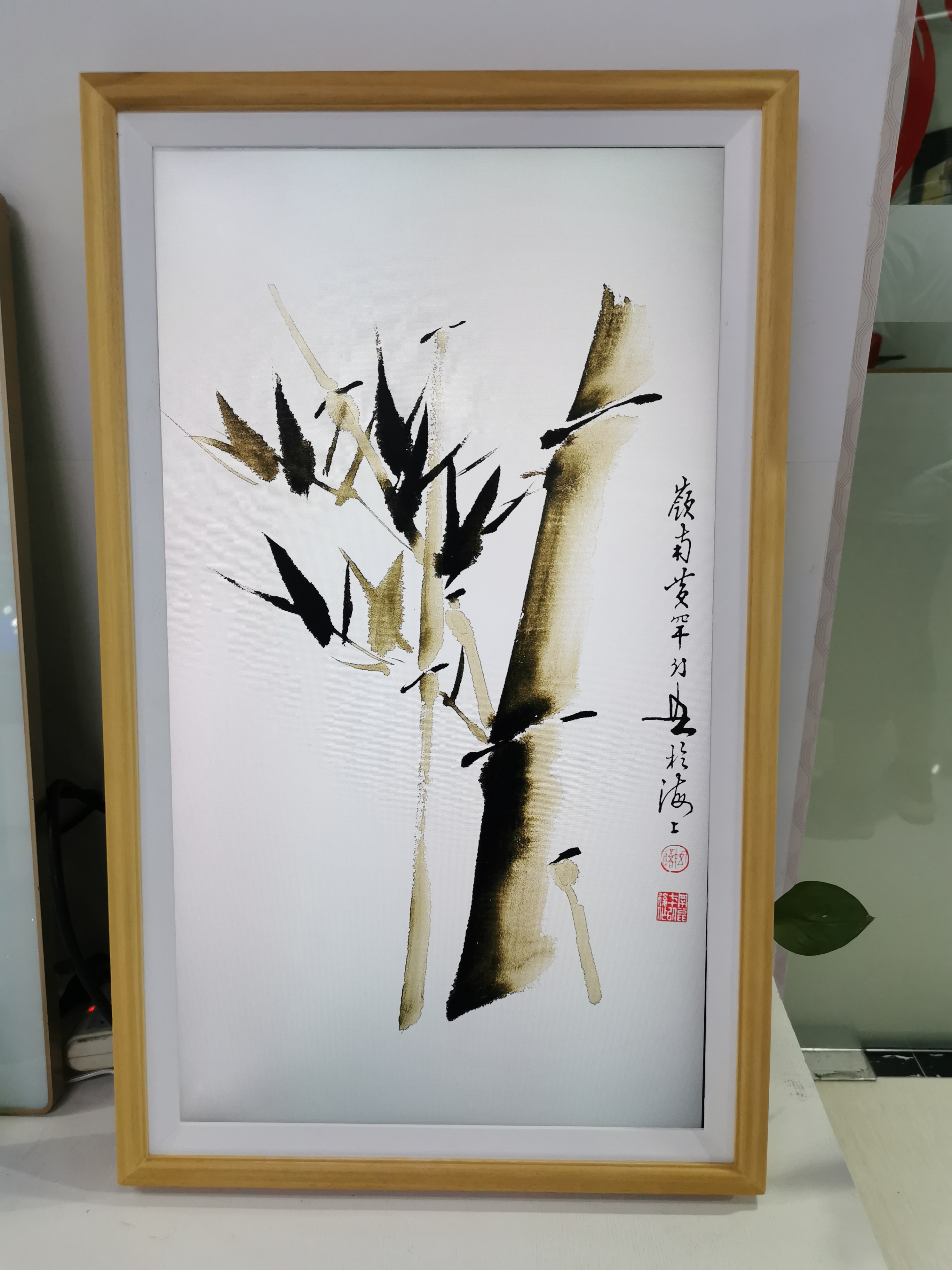 You see a digital screen inside a classic wooden frame. It looks like real art but shows digital images, videos, or ads. You can use it for decoration, art display, or business promotions.